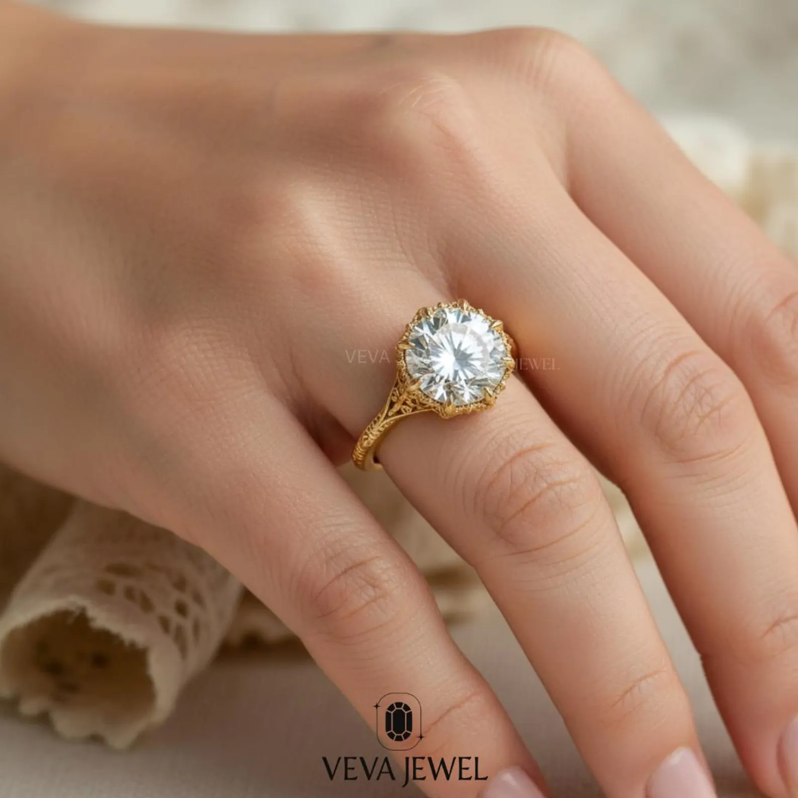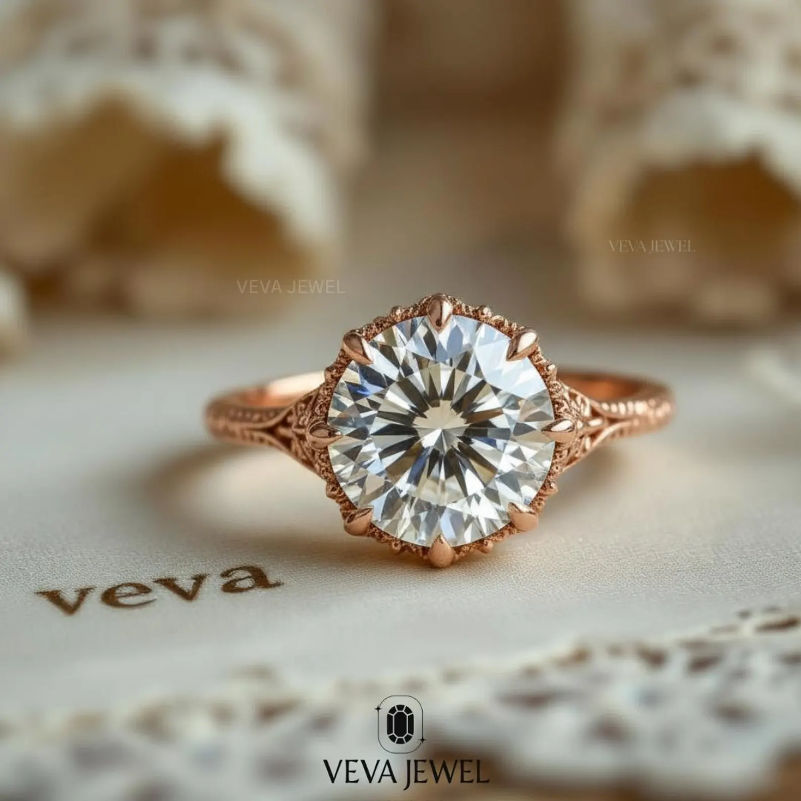 This ring features a 2 carat round brilliant cut diamond, beautifully set in a detailed antique-style gold filigree band. Inspired by the sophistication of 1920s jewelry design, the intricate craftsmanship brings a romantic and heirloom-like charm.