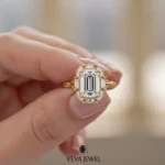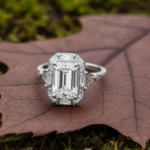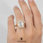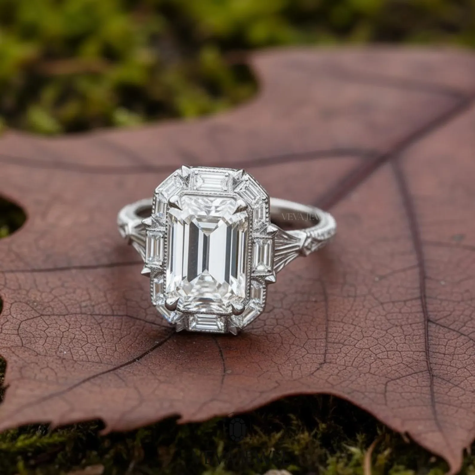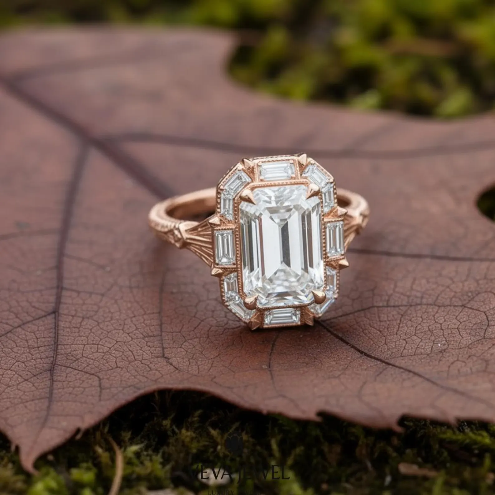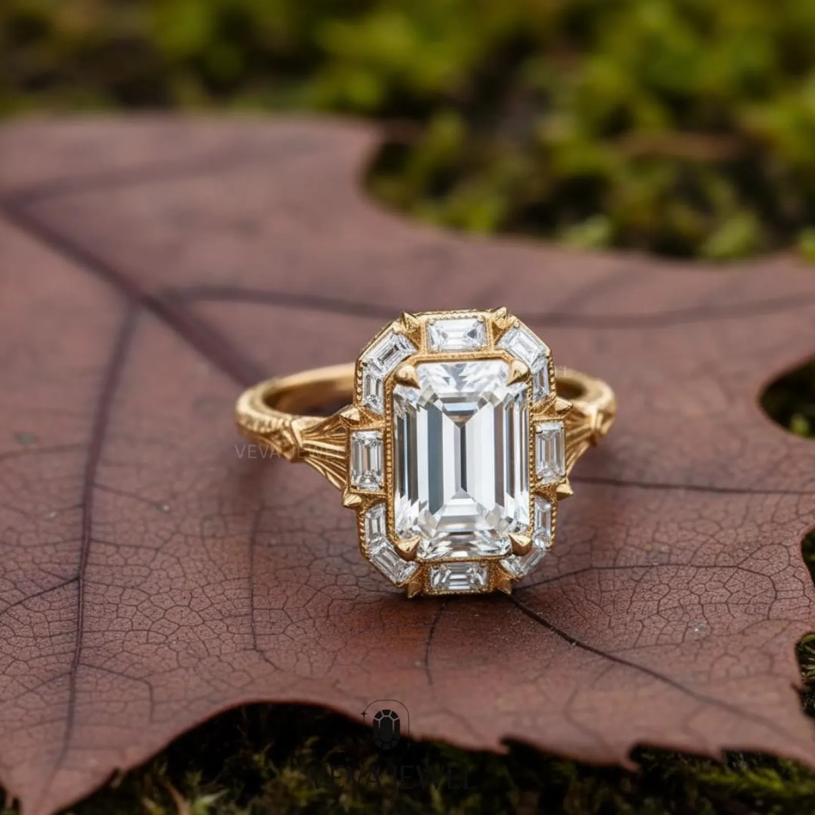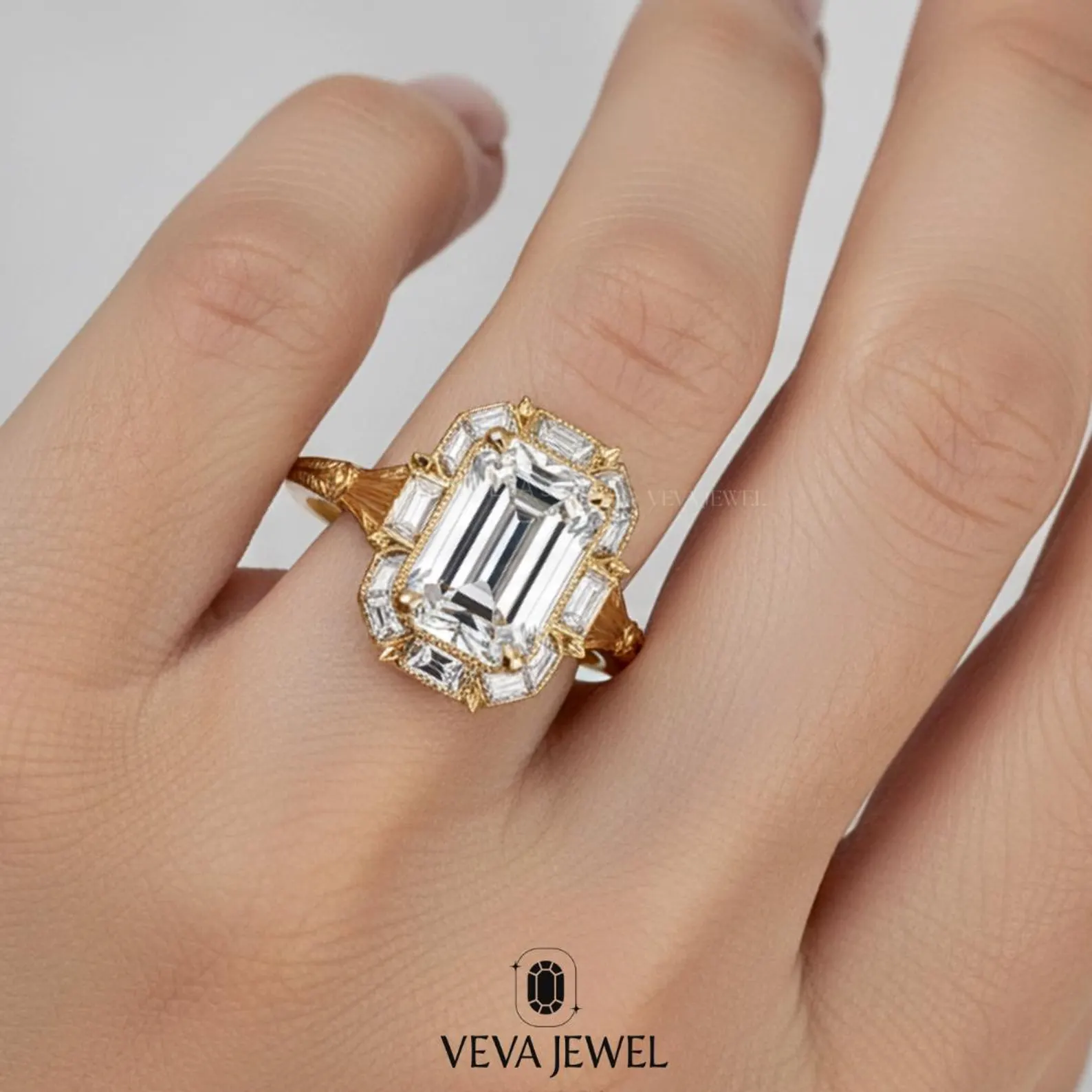 Step into timeless elegance with this 3 carat emerald cut diamond wedding ring, designed in a vintage sunburst Gatsby style. The radiant emerald cut center stone is framed by a unique starburst halo of accent diamonds, creating a bold and glamorous look reminiscent of the Art Deco era.