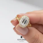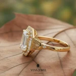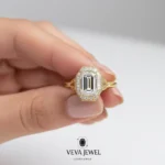 Halo Design: A captivating hexagonal halo, meticulously set with sparkling round and baguette diamonds, enhancing the center stone’s beauty and creating a unique silhouette.