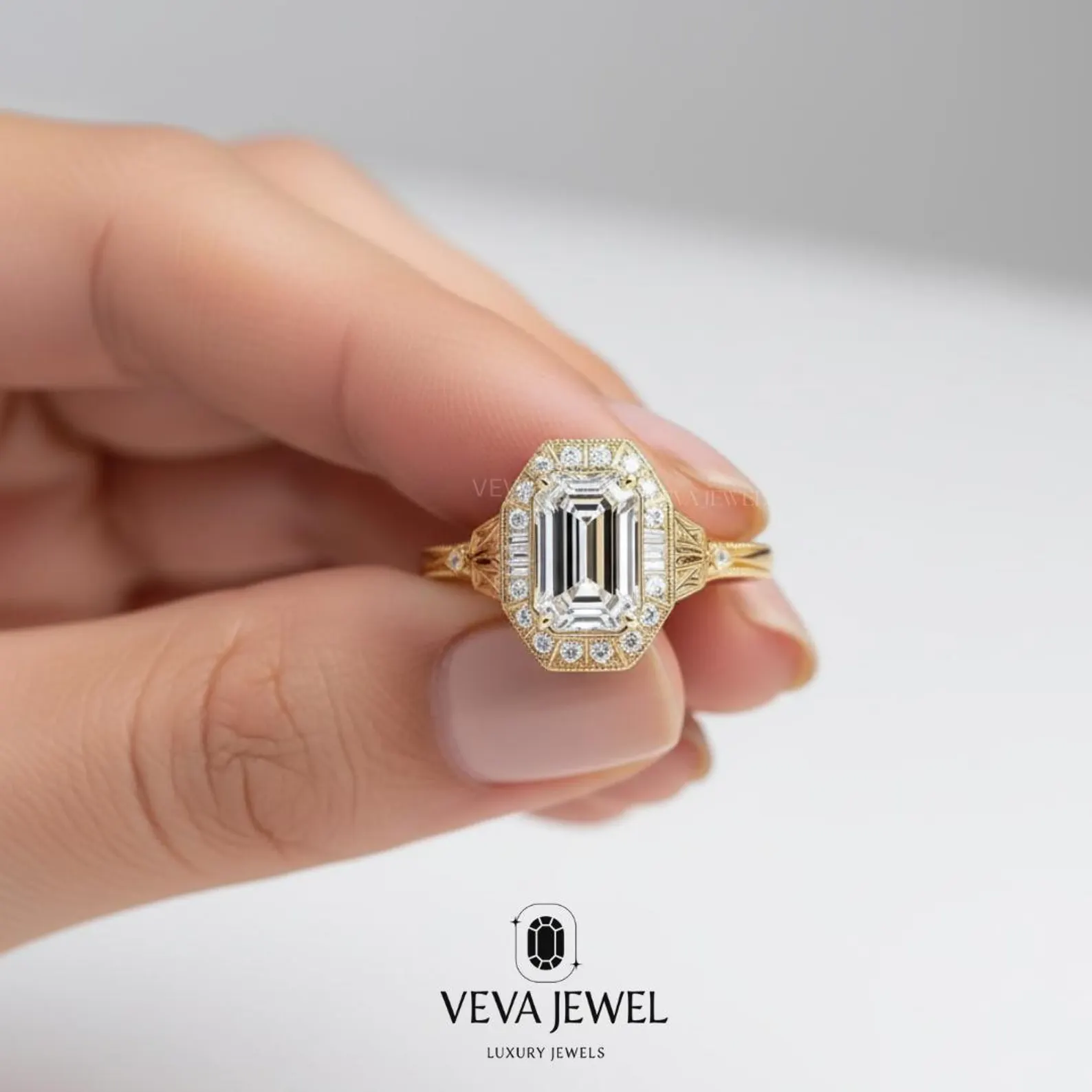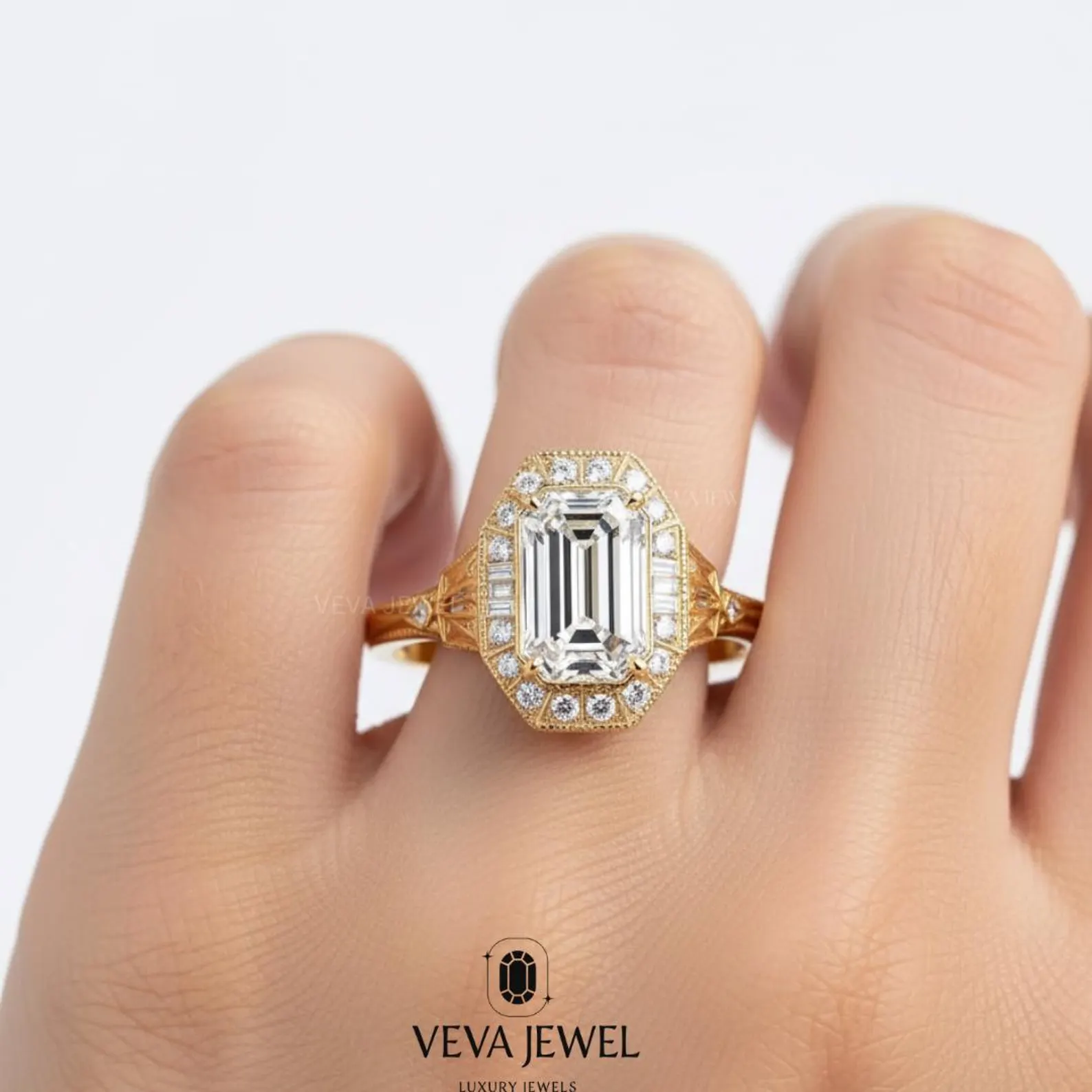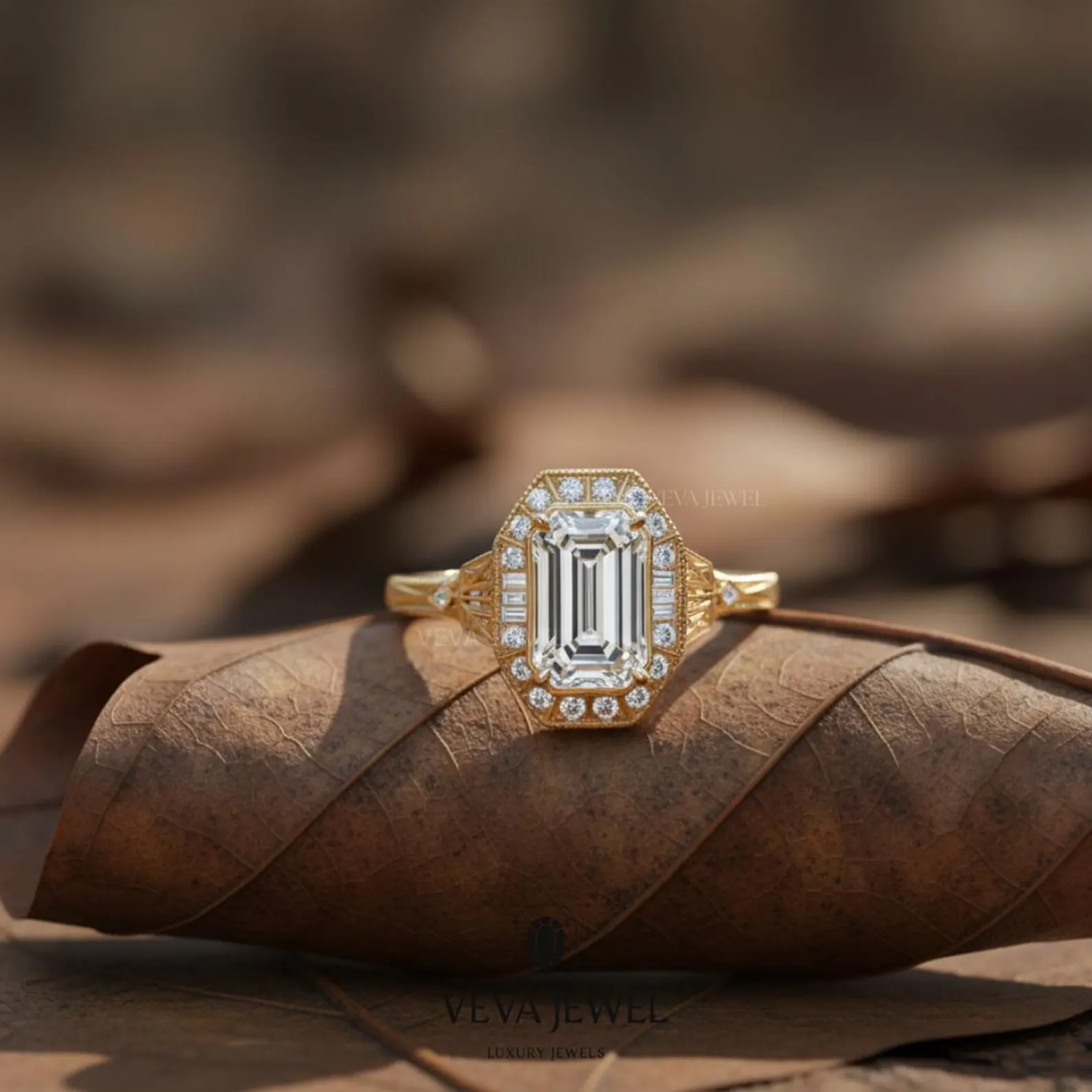 Home » Shop » Art Deco Emerald Cut Diamond Engagement Ring, Gold Vintage Style Bridal Ring, Unique Hexagon Halo Promise Ring
