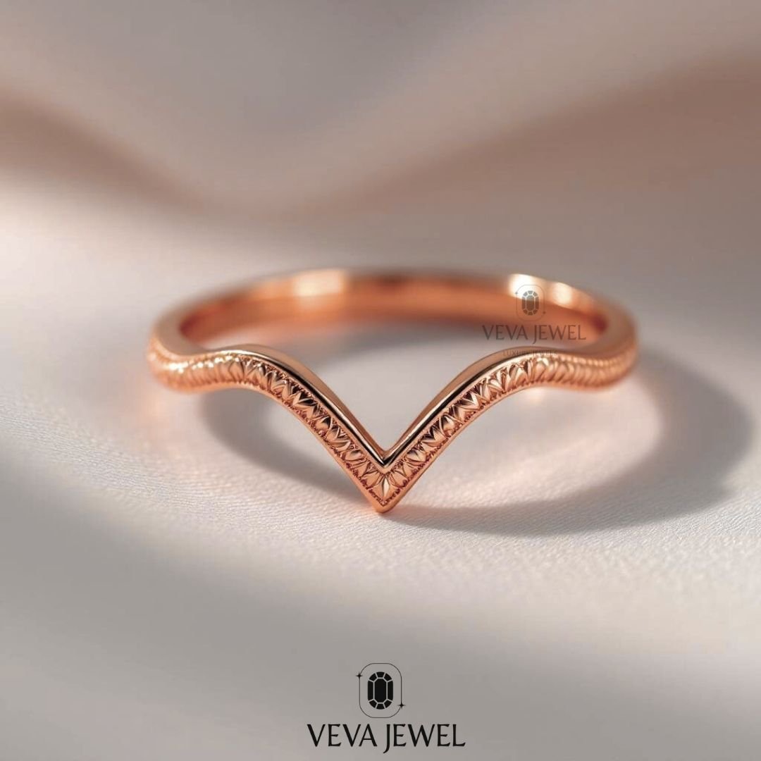 The chevron silhouette gently curves to pair beautifully with pear, marquise, or oval-shaped stones, or to stand alone as a minimalist wedding band. With its hand-engraved floral or geometric motifs, it offers heirloom quality with a touch of artisan craftsmanship.